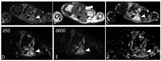 A 37-year-old female with D-TSGCT in the hand. (A) Axial fat-suppressed T2WI shows lobulated soft tissue with heterogenous SI around the third MCP joint (arrowhead). (B) Axial T1WI shows the mass with iso SI (arrowhead) and marked extrinsic bony erosion at the metacarpal bone (arrow) is noted. (C) Axial contrast-enhanced fat-suppressed T1WI shows the homogeneous enhancement of the mass (arrowhead). (D,E) Due to microcapillary perfusion, the mass shows an apparent high SI on the low b-value image of the DWI (arrowhead) compared to the high b-value image of the DWI. (F) The mass shows a low ADC value (arrowhead), suggesting diffusion restriction.