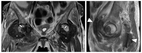 A 62-year-old female with amyloid arthropathy in both hip joints. (A) Coronal T2WI shows periarticular soft tissue masses (asterisks) extending to intra-articular space with heterogeneously low SI in both hip joints. Bony erosions at both femoral heads (arrows) are combined. (B) Sagittal T2WI shows that the mass infiltrates into the adjacent tendon and muscles (arrowheads).