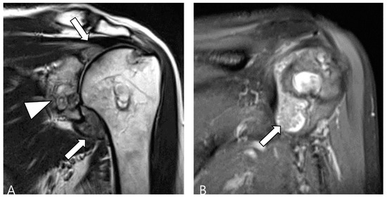 A 60-year-old female with rheumatoid arthritis of the shoulder. (A) Coronal T2WI demonstrates cystic and erosive change in the glenoid rim (arrowhead) with extensive synovial proliferation in the glenohumeral joint (arrows). (B) Coronal fat-suppressed T2WI shows multiple tiny low SI foci, known as ‘rice bodies’, within the hyperplastic synovium (arrow).