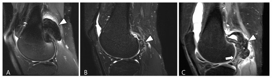 A 44-year-old male with FTS of the knee. (A,B) Axial fat-suppressed T2WI and sagittal T2WI show a well-defined high-SI mass containing strip-like low SI bundles at the popliteal fossa (arrows). (C) Sagittal contrast-enhanced fat-suppressed T1WI shows an ovoid-shaped mass with septal enhancement (arrowhead).