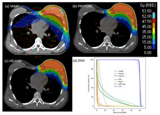 Example of dose distributions for left-sided breast cancer obtained with (a) VMAT, (b) proton, (c) helium ions. (d) Presents the dose volume histograms (DVH) for a single patient with the clinical target CTV in blue, LAD in red, heart in orange, left lung in green. The data from the VMAT plan are represented with dotted lines, from the proton plan with dashed lines and for the helium with solid lines. All the other DVHs can be found in the Supplementary Materials (Figure S3).