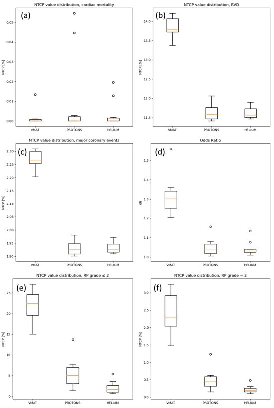 Boxplot distribution of the NTCP predictions for the different investigated clinical endpoints in the patient cohort: (a) heart cardiac mortality, (b) RVD, (c) heart major coronary events, (d) LAD coronary stenosis risk occurrence, (e) left lung RP grade ≤ 2 and (f) RP grade = 2. NTCP: normal tissue control probability, RVD: heart valvular dysfunction, LAD: left anterior descending artery, RP: radiation pneumonitis.