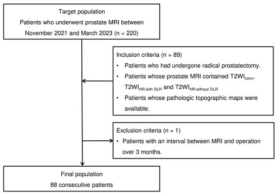 A total of 220 patients who underwent prostate MRI between November 2021 and March 2023 were initially considered eligible for this study. Among them, 88 patients satisfying the following inclusion criteria were finally included in the study. The inclusion criteria were as follows: (1) patients who had undergone radical prostatectomy; (2) patients whose prostate MRI scans contained three image datasets; and (3) patients who had a pathologic topographic map (whole-mount slide) and relevant information such as Gleason scores. The patient enrollment process is summarized in Figure 1.