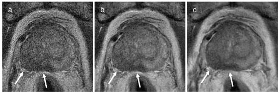 A representative case of a 74-year-old man with a Gleason score of 9 in the right middle peripheral zone demonstrating extra-prostatic extension through the right posterolateral capsule (arrows) on (a) a 2 mm thin-slice T2WI without deep learning reconstruction (DLR), (b) the same 2 mm T2WI with DLR, and (c) conventional T2WI with 3 mm slice thickness. For both reviewers, the confidence score for presence of extra-prostatic extension increased from 4 (probably present) on the 2 mm thin-slice T2WI with or without DLR to 5 (definitely present) on conventional T2WI.