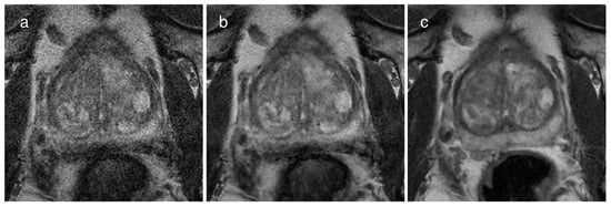 A representative case of a 67-year-old man with a Gleason score of 6 demonstrating the image quality of each image dataset on (a) a 2 mm thin-slice T2WI without deep learning reconstruction (DLR), (b) the same T2WI with DLR, and (c) conventional T2WI with 3 mm slice thickness. The subjective image quality score was the best on conventional T2WI, followed by the thin-slice T2WI with DLR and the same T2WI without DLR. Specifically, the scores were 5, 4, and 3, respectively, for reviewer 1 and 4, 3, and 2, respectively, for reviewer 2.