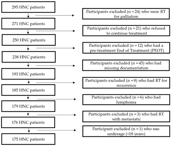 The patients included were ≥18 years of age, diagnosed with HNC, intended for curative treatment of RT or CCRT, and had their weight (kg) and height (cm) documented before and after completing the treatment. The HNC patients excluded were those with distant metastases, receiving treatment with palliative intent, those who discontinued treatment or died during the course of therapy, and any patient with missing documentation of study variables. Patient TNM staging (T refers to the primary tumor, N refers to whether lymphatic nodes are affected, and M refers to further metastases) (National Cancer Institute; NIH, 2015) was classified into four groups according to cancer stage: I, II, III, and IV. Cancer stages were classified further into two groups: early (stages I and II) and advanced (stages III and IV) [10]. The sample distribution according to the inclusion and exclusion criteria is described in Figure 1. In addition, tumor site was categorized into four groups: cancer in the oral cavity, pharynx (oro-, naso-, or hypopharynx), larynx, and another group that included the neck and maxilla.