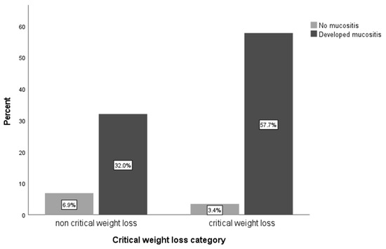 Although numerous studies are currently underway in this area, no definitive conclusion has yet been established, as certain risk factors have not proven to be reliable indicators. We hypothesized that HNC patients are at high risk of weight loss during radiotherapy (RT) (+/− chemotherapy), which is considered, with BMI as the pretreatment, a prognostic factor. Weight loss is a significant health problem among patients with HNCs that is attributable primarily to the tumor or tumor therapy [9]. Therefore, this study’s primary goal was to investigate and determine the possible factors that influence CWL among patients with HNC who received radiation or concurrent chemoradiotherapy (CCRT). The study’s secondary goal was to demonstrate the potential toxicities’ correlation with the weight loss percentage.