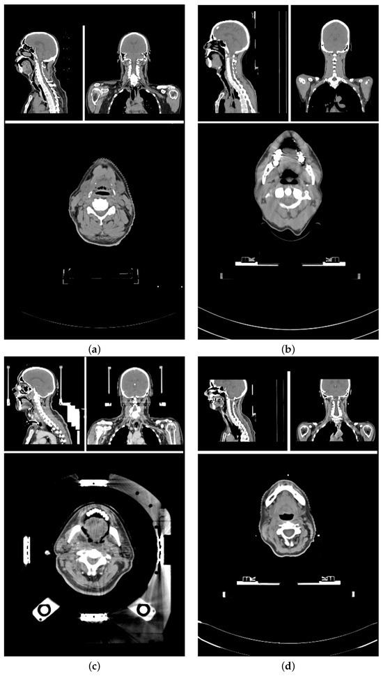 Figure 1 shows an exemplary CT scan of each cohort. All patients received radiotherapy for head and neck cancer. For each patient, there was exactly one planning CT scan considered in this study. Each CT scan consists of 90 to 220 single slices (mean: 141 ± 24) of 512 × 512 voxels each. The voxel size ranged from 0.98 × 0.98 × 2