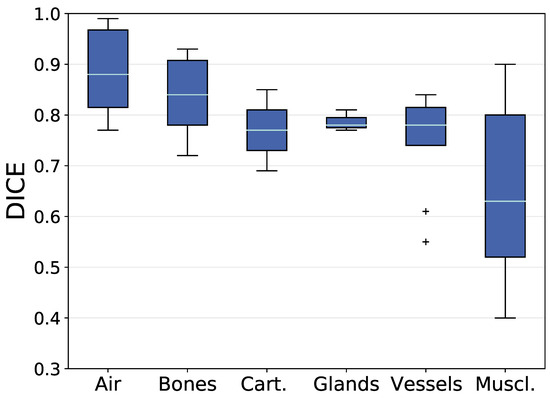 When comparing the grouped DICEm between tissue types, groups with good contrast on CT scans like air-related structures and bones show an increased accuracy when compared to other groups. Noticeably, the variation in DICEm is the largest for the group of muscles. First, this group has the largest number of different anatomical instances. Further, the contrast of soft tissues on CT scans is not sufficient to identify most muscles completely. Finally, the group of muscles is also the most diverse group ranging from structures with an average volume of 550 voxels (digastric muscle) to 55,000 voxels (trapezius muscle).