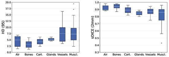 https://metrics-reloaded.dkfz.de/ (accessed on 20 October 2023). Structures that are not present in the manual labels, in the predicted labels or both sets of labels are left out in the analyses. For the calculation of all metrics, the library surface-distance-based-measures Version 0.1 was used.