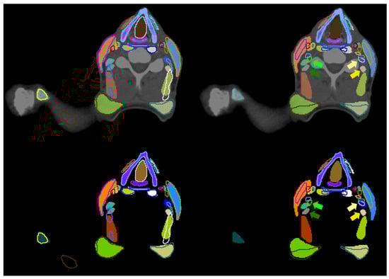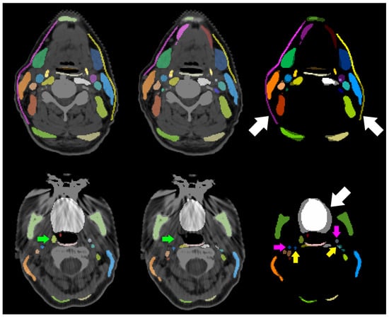 Figure 6 shows this for the tonsil (green arrows). This results in largely deviating contours between both observers as visualized in the right column of