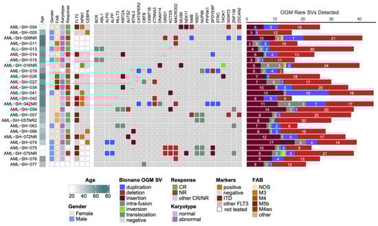 Oncoprint schematic of the characteristics, cytogenetics, and targeted mutational analyses for the 26 leukemia samples included in this study. FAB denotes a French–American–British classification. As for the response, NR is a non-responder, and CR is a complete responder. Positive cytogenetics and marker results indicate detected mutations, while negative results indicate a wildtype. The SVs overlapping protein-coding genes and never detected in healthy volunteers are also displayed. SV color-coding is maintained throughout the manuscript for clarity. Burgundy, insertion; bright red, deletion; green, inversion; blue, duplication; and teal, intra-fusions/translocations. For the response category, “other” signifies “morphologic remission and MRD-positive” for −015 and “initial NR upon induction (7 + 3) but CR upon treatment with fludarabine, then mitoxantrone + etoposide” for −063. The right side bar graph depicts the total numbers of the highly filtered SVs detected in each of the patient samples using OGM.