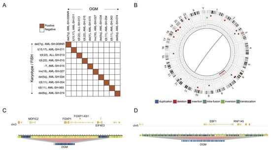 Our cohort of samples represent several genetically simple and/or “normal” karyotypes and other more perturbed samples, as reported by traditional cytogenetic analyses (Figure 1). OGM detected all the variants that had originally been discovered through traditional cytogenetics with 100% concordance (Figure 2A), similar to other studies which have utilized OGM in hematological malignancies [16,26,27,28,29,30,31,32,33,34]. All the SVs overlapping protein-coding genes in at least two samples and at 0% frequency in a database of healthy volunteers are depicted in the oncoprint image in Figure 1, and a comprehensive list of all the detected structural variants is provided in Supplemental Table S2.