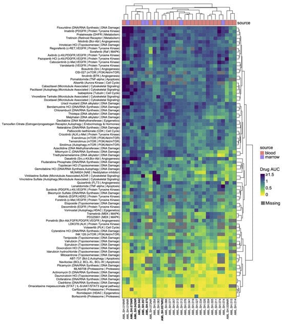 The “Best” (default) parameter was selected to test the models with different parameters and select the best goodness-of-fit model. The AUC for all the samples were consolidated and used for the downstream analysis. The drug target and pathway information was obtained from the Selleckchem L3000 Anti-cancer Compound Library information sheet (https://file.selleckchem.com/downloads/library/20201228-L3000-Anti-cancer-Compound-Library-96-well.xlsx (accessed 16 August 2023)).