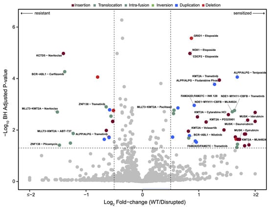 Volcano plot showing the magnitude and significance for unbiased drug–SV interactions. Each circle represents a drug–SV interaction. Significant interactions are denoted with colors corresponding to the SV type. Selected protein-coding drug–SV interactions discussed in the main text are labelled. The horizontal and vertical lines represent the significance thresholds of adjusted p-value (<0.05 and see Section 2.6) and AUC fold change (1.5-fold), respectively. The SV types disrupting each gene in the “disrupted” samples are denoted using the same color codes as Figure 1.
