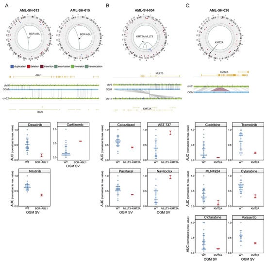Known leukemic SV events are associated with sensitivity or resistance to clinically relevant drugs. (A) (Upper panels) Circos plots denoting t(9;2) BCR-ABL1 translocations in samples ALL-SH-013 and ABL-SH-015, as determined using OGM. (Middle panels) Gene-level map showing the translocation breakpoint. (Lower panels) Drug sensitivity plots to Dasatinib, Nilotinib, and Carfilzomib of the relative AUC values of the WT vs. BCR-ABL1 translocated samples. (B) (Upper panel) Circos plot example from a sample with a t(9,11) MLLT3-KMT2A translocation. (Middle panels) Gene-level map depicting the MLLT3-KMT2A gene fusion breakpoint. (Lower panels) Drug sensitivity scatter plots (for Cabazitaxel, Paclitaxel, ABT-737, and Navitoclax) of the relative AUC values of the WT vs. MLLT3-KMT2A translocated samples. (C) (Upper panel) Circos plot example from a sample with a KMT2A partial tandem duplication SV (Chr. 11, arrow). (Middle panels) Gene-level map depicting said KMT2A partial tandem duplication SV and its location. (Lower panels) Drug sensitivity plots of the relative AUC values of the WT vs. KMT2A partial tandem duplicated samples.