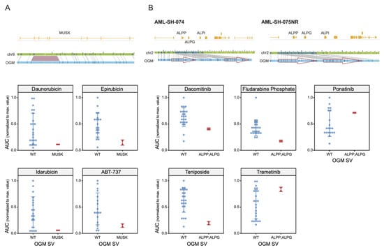 In sum, we have demonstrated that the genome-wide detection of SVs using OGM [14,15,16,17,18,19,20,21,22,26,27,28,29,30,31,32,33,34] can be associated with predictions of sensitivity or resistance to various oncology drugs and that this approach could be a valuable biomarker identification system of potential clinical relevance. Due to the ex vivo nature of our studies, our drug response studies are limited to agents acting on the tumor itself. Accordingly, immunotherapies, such as CAR-T approaches, bifunctional antibodies, and T-cell engagers, that have been successful in the treatment of B-cell malignancies and that are still undergoing clinical testing for AML are beyond the scope of our studies. As such, we decided to focus on FDA-approved small molecules with the hope of identifying novel SV biomarkers of clinically relevant agents currently applied in AML but also to potentially identify drugs that have already been approved for other conditions that could potentially be re-purposed for patients with leukemia. We believe that such findings could be important, for example, for groups of patients that are not responsive to current standard chemotherapy and who are not eligible for clinical trials for various reasons.