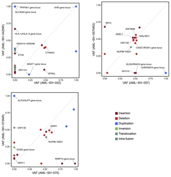 Plots of changes in SV variant allele fractions (VAF) during disease progression. VAF differences from a sample upon presentation (x-axis) vs. after relapse (y-axis) for samples 042, 057, and 075.