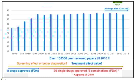 Also, during periods of improved drug-induced survival in the Netherlands, the proportion of stage I patients increased from 28% to 41% and the proportion of stage II patients decreased from 51% to 33%, with 91% relative survival [], which makes it particularly difficult to approve new drugs and evaluate the impact of screening even 83 individual medicines plus the 6 NCI-approved combinations that are available. A recent study of 124 drugs with US Food and Drug Administration (FDA) approval in 374 indications (2003–2020) showed that new anticancer medicines were associated with an improvement of 2.8 months (Inter Quartile Range IQR: 2.0–4.6 months) for overall survival (OS) and 3.30 months (IQR) 1.5–5.6 months) for progression-free survival (PFS) [].