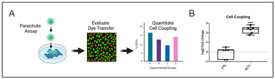 aCT1 promotes gap junction intercellular communication in refractory HER2+ breast cancer cells. (A) Parachute assay used to determine cell coupling as a measure of gap junction intercellular communication. Created with Biorender. (B) Quantitation of parachute assay from JIMT-1 cells treated with PBS as a control (CTL) or 250 μM aCT1 for 6 hrs. Student’s t-test, unpaired with Welch’s correction **** p < 0.0001.