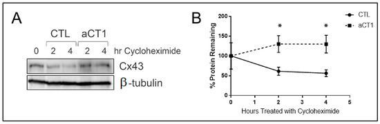 A number of reports have indicated that the half-life of Cx43 is within a range of <4 h (hrs) [49,50,51,52,53,54,55]. However, the stability of Cx43 appears to be extended by being within the gap junction plaque structure [56]. These reported observations prompted us to investigate whether the increased GJIC we observed upon aCT1 treatment would lead to increased Cx43 protein stabilization. We treated JIMT-1 cells with PBS or aCT1 for up to 4 h in the presence of the protein synthesis inhibitor cycloheximide to look at protein degradation. We then evaluated the levels of Cx43 protein expression by Western blotting and saw that aCT1 treatment prevented Cx43 degradation, whereas Cx43 levels declined in the absence of aCT1 (Figure 2A). Cells treated with aCT1 and cycloheximide had higher levels of Cx43 than CTL cells treated with cycloheximide (Figure 2B).
