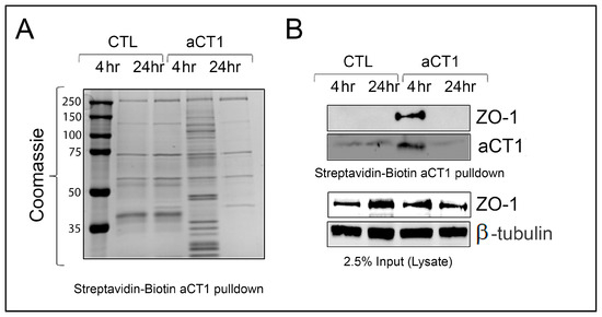 To identify proteins bound to aCT1, we submitted aCT1 pulldown samples generated from JIMT-1 cells treated for 4 h for sequencing at the Indiana University School of Medicine Center for Proteome Analysis. To confirm the validity of our assay, we assessed the aCT1 pulldown samples for binding to ZO-1 and confirmed that aCT1 binds ZO-1 by Western blot (Figure 3B). Overall, the proteomic analysis identified >2500 proteins, and 354 of those proteins were bound to aCT1 with high confidence (p-value < 0.0001; Supplemental File S1). We also confirmed the presence of ZO-1 bound to aCT1 in our proteomics data. Caveolin, β-catenin, p120-catenin, and tubulin were also among the >2500 proteins identified.