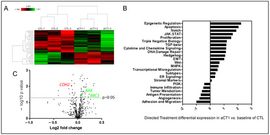 aCT1 impacts gene expression. (A) Heat map showing genes that were significantly upregulated (in green) and downregulated (in red) in JIMT-1 cells comparing CTL and aCT1 treatment. (B) Directed differential expression analysis of aCT1- vs. CTL- treated JIMT-1 cells and sorted into the pathways represented by the NanoString Breast Cancer 360 nCounter panel. (C) Volcano plot of individual genes that were altered in aCT1 vs. CTL treated JIMT-1 cells. Upregulated genes BAX and BBC3 outlined in green and downregulated gene CDH2 outlined in red. Analysis performed using the nSolver 4.0 software.