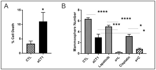 aCT1 promotes cell death. (A) JIMT-1 cells treated with PBS as a control (CTL) or 250 μM aCT1 were analyzed in monolayer culture using trypan blue exclusion. Unpaired student’s t-test with Welch’s correction * p < 0.05. (B) JIMT-1 cells treated with PBS as a CTL, 50 μM aCT1, 100 nM lapatinib, 500 nM of cisplatin, a combination of aCT1 + laptinib (a + L) or aCT1 + cisplatin (a + C) were assessed by mammosphere assay. One-way ANOVA with Tukey’s multiple comparisons. * p < 0.05, *** p < 0.001, **** p < 0.0001.