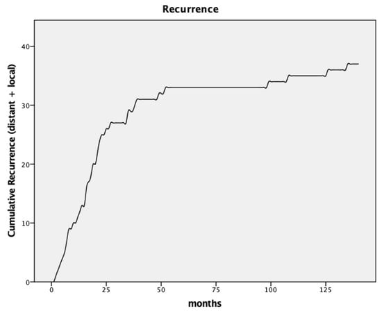 During a median follow-up of 88.5 months, 38 patients (20.2%) experienced recurrences. Local recurrences occurred in 15 patients, equating to a rate of 8.0%. Liver and lung metastases were observed in 12 (6.4%) and 7 (3.7%) patients, respectively. Three patients (1.6%) had multi-site metastases. One patient had a metastatic cervical lymph node as the sole site of recurrence. Figure 1 illustrates the cumulative appearance of recurrences. Table 2 and Table 3 provide an overview of the pathological findings and recurrences. Results of the submitted doctoral thesis have been incorporated [9].