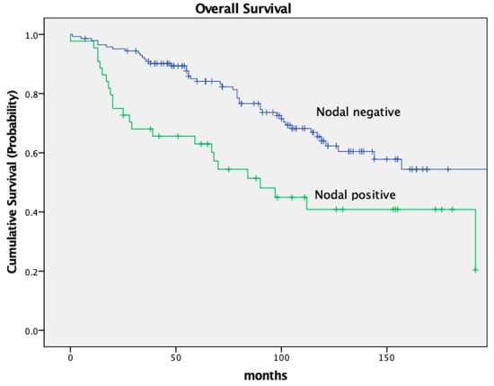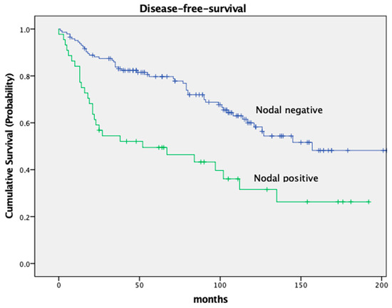 The DFS was significantly different in both groups as well, with a 5-year DFS of 79.7% in node-negative patients and 49.5% in node-positive patients (p < 0.001). Both OS and DFS in relation to nodal stage are depicted in Figure 2 and Figure 3.