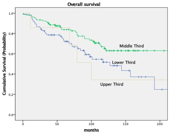 OS and DFS also varied based on the tumor’s location within the rectum. Low-lying tumors (<6 cm from the anal verge) had worse OS and DFS compared to tumors located in the middle or upper third of the rectum. Patients with a tumor in the lower third had an OS of 72.1% and a DFS of 67.2%; patients with a tumor in the middle third of the rectum had an OS of 83.8% and a DFS of 77.3% (OS p = 0.09, DFS p = 0.011). For details, see Figure 5 and Figure 6 and Table 5.
