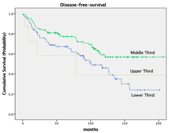 Kaplan–Meier curves for disease-free-survival, location of tumor.