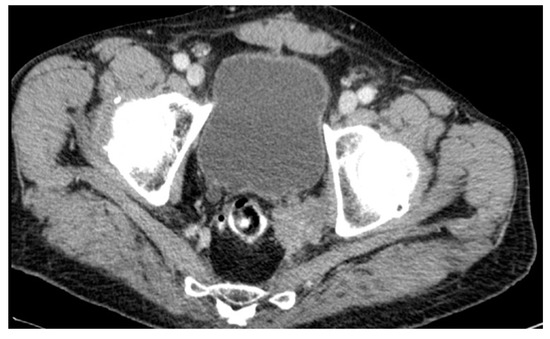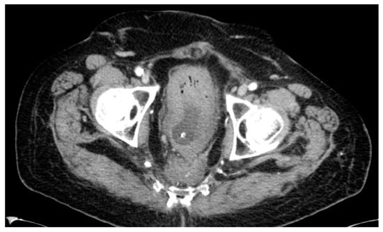 A lateral local recurrence with infiltration of the ureter and bladder was found in a male patient after AR in July 2001. The initial histological finding revealed an ypT2ypN1-tumor. Adjuvant therapy was recommended but was refused by the patient. The five years of regular follow-up were unobtrusive. Eventually, the patient underwent further diagnostic investigation in 2012 because of elevated tumor markers (CEA levels). A CT scan confirmed recurrence in the pelvic wall 135 months after surgery (see Figure 7). The tumor was histologically confirmed through transanal biopsy. The therapy consisted of an extended surgery with resection of the urethra and bladder after local radiation and chemotherapy, but an R0-resection could not be achieved. Furthermore, the patient developed lung metastases and received radiotherapy. The patient died 5 years after diagnosis of local recurrence in 2017.