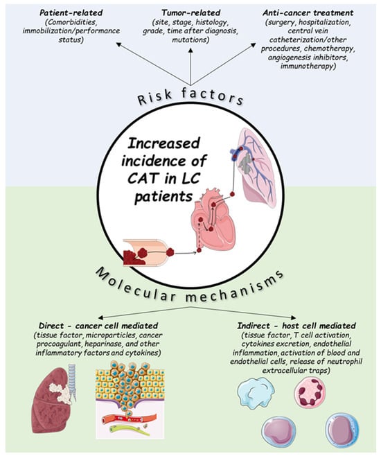 Multiple factors account for the increased incidence of CAT in LC patients, and can be divided into two categories: individual patient- and cancer-associated factors [2,10]. Regarding the individual patient-related factors, the impact of age and sex is not clearly defined [2,11,12,13]. Co-morbidities such as anemia, obesity and chronic obstructive pulmonary disease (COPD) have been found to increase the VTE risk in LC patients; however, the effects of diabetes, hypertension, pulmonary tuberculosis and cardiovascular disease are not established [12]. Immobilization (can be evaluated clinically by the performance status) is also a significant risk factor, while the effect of smoking appears to be non-significant [2,12]. Regarding the cancer-related factors, these can be further divided into factors that are associated with the tumor itself or with the anticancer treatment [2,12,13] (Figure 1). LC is usually diagnosed in the advanced or metastatic disease stage [14], which is known to confer an increased risk of thrombosis [15]. The association of locally advanced or metastatic disease and VTE in LC patients has been demonstrated in large-cohort studies (locally advanced stage, adjusted HR: 2.9 (95% CI: 2.3–3.5), p < 0.001; metastatic stage, adjusted HR: 2.5 (95% CI:2.3–2.7), p < 0.001) [16]. VTE occurrence remains an important predictor for early mortality in metastatic NSCLC patients [17].