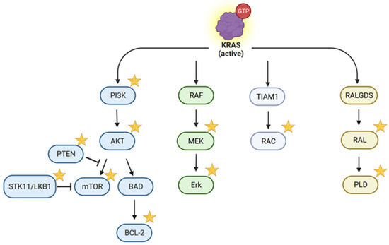 Liver kinase B1 (LKB1, also known as STK11) is another tumor suppressor gene [33] that is frequently co-mutated with KRAS in NSCLC (Figure 3) [34,35]. LKB1 is a serine/threonine kinase that regulates cell metabolism, cell polarity, and growth through the 14 AMP-activated protein-kinase-related kinases (AMPKRs), including salt-inducible kinase (SIK; including SIK1, SIK2, and SIK3) [36]. Hollstein et al. [37] used CRISPR technology to study the role of SIK in Kras-G12D mice and found that loss of SIK1 and SIK3 redundantly mediated the tumor-suppressor activity of LKB1 and accelerated tumor growth in KRAS-driven lung cancer.