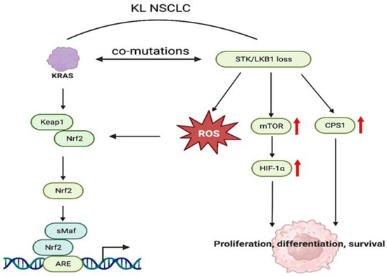 Interaction between KEAP1 and LKB1 in KRAS-mutant NSCLC. KL, KARS, and LKB1 co-mutation; sMaf, small musculoaponeurotic fibrosarcoma; ARE, antioxidant response element; HIF-1α, hypoxia-inducible factor 1 α; CPS1, carbamoyl phosphate synthetase 1; ROS, reactive oxygen species. (created with BioRender.com, accessed on 29 October 2023).