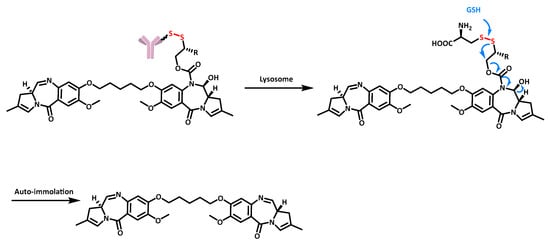 - Pillow, T.H.; Schutten, M.; Yu, S.-F.; Ohri, R.; Sadowsky, J.; Poon, K.A.; Solis, W.; Zhong, F.; Del Rosario, G.; Go, M.A.T.; et al. Modulating Therapeutic Activity and Toxicity of Pyrrolobenzodiazepine Antibody–Drug Conjugates with Self-Immolative Disulfide Linkers. Mol. Cancer Ther. 2017, 16, 871–878. [Google Scholar] [CrossRef] [PubMed]