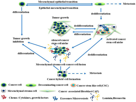 The preliminary prevailing hypothesis suggests that tumor-initiating cells are derived from normal stem cells rather than from progenitor cells; the development of CSCs from normal stem cells and from progenitor stem cells has been shown [156,184,185]. Figure 3 outlines the pathways by which MSCs develop from either normal stem cells or cancer progenitor cells. In addition to their origin and unique properties, CSCs serve as an experimental model by which the mechanisms of tumor progression, recurrence, and treatment resistance can be investigated.