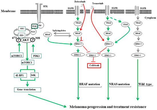 The common mechanisms of melanoma progression and treatment resistance. PI3K/AKT/mTOR and RAS/RAF/MEK/ERK pathways are the most characterized tumor growth/treatment resistance-driving signals in melanoma. The activation of PI3K/AKT/mTOR is tightly controlled via a multistep process that can be initiated through tyrosine kinase receptors (RTKs) such as IGF-1R. The stimulation of IGF-1R by its ligand triggers the activation of PI3K via their catalytic (p110) and regulatory (p85) subunits leading to the conversion of phosphatidylinositol (3,4)-bisphosphate (PIP2) lipids to phosphatidylinositol (3,4,5)-trisphosphate (PIP3) allowing PDK1 to phosphorylate the tyrosine 308 (T308) residue and mTORC2 to phosphorylate tyrosine 473 (T473) in the activation loop of AKT. Activated AKT then activates mTORC1 that, in turn, enhances the activation of the eukaryotic translation initiation factor 4E binding protein 1 (4EBP1), and ribosomal protein S6 kinase (S6K). The activation of the Ras/RAF/MEK/ERK signaling pathway is mediated by the stimulation of epidermal growth factor (EGF) by its ligand for BRAF wild type or by active mutation in the cells bearing a NRAS mutation. The treatment of melanoma cells bearing BRAFV600E with specific inhibitors (e.g., dabrafenib) stimulates melanoma cells to overcome the inhibitory effect of BRAF through the generation of BRAF isoforms via alternative splicing. Treatment of patients with a NRAS mutation (NRASQ61R) with MEK inhibitors (e.g., trametinib) generates ERK negative feedback effects on RAS, which creates a bypass mechanism through activation of ARAF and/or CRAF to replace functional BRAF.