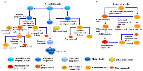 Proposed model for cancer stem-like cell (CSC)/melanoma stem cell (MSC) generation from normal and cancer cells. (A) Generation of CSCs/MSCs results from the transformation of normal stem/progenitor cells into undifferentiated cancer cells via multiple genetic mutations and dedifferentiation-dependent mechanisms. (B) Generation of MSCs from cancer cells. This model describes the generation of MSCs from tumor cells through the activation of aberrant signaling pathways via driver mutations to tumor growth signaling pathways and activation of self-renewal genes. MSCs become educated to divide into tumor progenitor cells/MSCs. The produced MSCs possess genetic properties which allow for the division into one differentiated cell and one MSC. Once the dedifferentiation process of the differentiated cell is complete, the dedifferentiated cells can be transformed into MSCs. CSCs/MSCs undergo abnormal asymmetric cell division to produce two daughter cells, one CSC and one non-CSC.