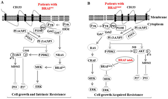 A proposed model for Fyn-CD133 signaling to the PI3K pathway induces melanoma intrinsic and acquired resistance to anti-cancer agent in melanoma cells. (A) Fyn stimulated CD133 signaling to the PI3K pathway in melanoma population bearing the BRAF wild type (BRAFWT) is mediated by Fyn/CD133/PI3K/PDK1/AKT-induced inhibition of p27, Fyn/CD133/PI3K/AKT/MDM2-induced ubiquitination of p53 and Fyn/CD133/Grb2/Grb7/NRAS7BRAF/MEK/ERK-induced cell growth. (B) Intrinsic resistance of melanoma cells: Fyn stimulated CD133 signaling to the Grb2/Grb7/NRAS7BRAF/MEK/ERK pathway is responsible for acquired resistance of BRAF inhibitors (e.g., dabrafenib).