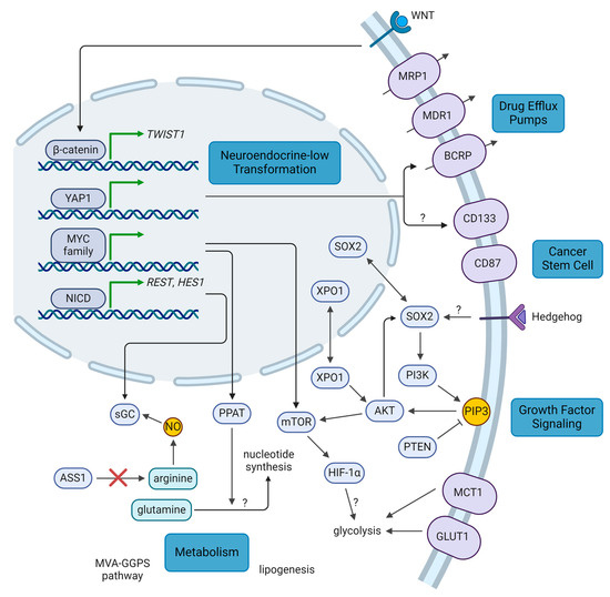 Summary of key molecular pathways in therapeutic resistance. WNT, YAP1, NOTCH, and MYC signaling promote transformation to a resistant, neuroendocrine-low phenotype. Cancer stem cell factors such as SOX2, CD133, and CD87 promote a resistant cell state that survives treatment. Expression of drug efflux pumps may also be associated with this cell state. Growth factor signaling pathways promote cell proliferation and therapeutic resistance. Certain resistance pathways may have metabolic dependencies that can be targeted. Question marks: mechanisms which remain uncertain or unknown. AKT: AKT serine/threonine kinase, ASS1: argininosuccinate synthase 1, BCRP: breast cancer resistance protein, GLUT1: glucose transporter 1, HES1: hes family bHLH transcription factor 1, HIF-1α: hypoxia inducible factor 1α, MCT1: monocarboxylate transporter 1, MDR1: multidrug resistance protein 1, MRP1: multidrug resistance associated protein 1, mTOR: mechanistic target of rapamycin kinase, MVA-GGPS: mevalonate-geranylgeranyl pyrophosphate, MYC: MYC proto-oncogene, NICD: NOTCH intracellular domain, NO: nitrous oxide, NOTCH: Notch receptor, PI3K: phosphatidylinositol-4,5-bisphosphate 3-kinase, PIP3: phosphatidylinositol (3,4,5)-trisphosphate, PPAT: phosphoribosyl pyrophosphate amidotransferase, PTEN: phosphatase and tensin homolog, REST: RE1 silencing transcription factor, sGC: soluble guanylyl cyclase, SOX2: SRY-box transcription factor 2, TWIST1: twist family bHLH transcription factor 1, WNT: Wnt family, XPO1: exportin 1, YAP1: Yes1 associated transcriptional regulator (created with BioRender.com, accessed on 4 October 2024).