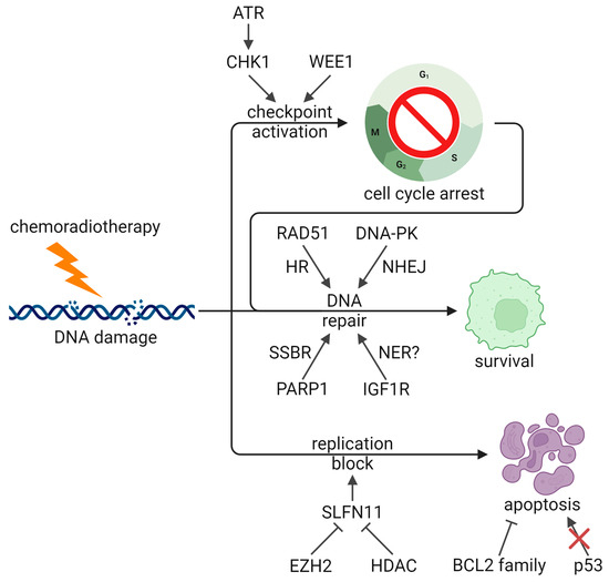 DNA damage response and apoptosis pathways in therapeutic resistance. ATR/CHK1 and WEE1 promote cell cycle arrest to promote repair, and several DNA repair pathways are implicated in promoting treatment resistance and survival. EZH2 and HDACs inhibit SLFN11-mediated replication block and apoptosis, and both BCL2 activity and TP53 loss also block apoptosis. ATR: ATR serine/threonine kinase, BCL2: BCL2 apoptosis regulator, CHK1: checkpoint kinase 1, DNA-PK: DNA-dependent protein kinase, EZH2: enhancer of zeste 2 polycomb repressive complex 2 subunit, HDAC: histone deacetylase, HR: homologous recombination, IGF1R: insulin like growth factor 1 receptor, NER: nucleotide excision repair, NHEJ: non-homologous end joining, PARP1: poly (ADP-ribose) polymerase 1, RAD51: RAD51 recombinase, SLFN11: schlafen family member 11, SSBR: DNA single strand break repair, TP53: tumor protein p53, WEE1: WEE1 G2 checkpoint kinase (Created with BioRender.com, accessed 4 October 2024).