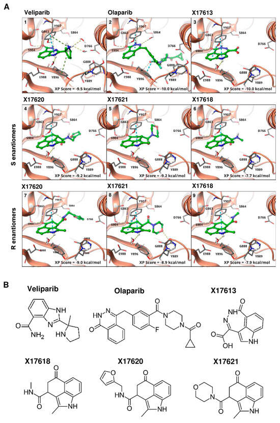 (A) Binding modes of veliparib (1), PDB: 7AAC), olaparib ((2), PDB: 7AAD), and selected compounds from virtual screening ((3–9), PDB: 4PJT) to PARP-1. The binding to either G863 or S904, as also found for veliparib, was used as a constraint in docking. All active compounds are able to form this bond and adopt a similar binding mode. Through the indole NH, there is an interaction with E988 by a bridging water molecule. No preference between the binding modes of the S- (4–6) or R-enantiomers (7–9) is observed, while the scoring values also differ only slightly. (B) Chemical structure of the most active compounds X17613, X17618, X17620, and X17621, according to in vitro screening and the two established PARPi veliparib and olaparib.