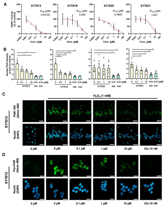 (A) Concentration–response curves of four potential PARP-1 inhibitors with the highest activity in the PARP-1 screening assay kit. All concentrations were tested in duplicates. IC50 values were derived using a nonlinear regression model in GraphPad Prism 9 (n = 2). (B) Investigation of PARP inhibition by X17613, X17618, X17620, and X17621 in HCT116 cells. Cells were challenged with 1 mM H2O2 for 5 min and pretreated or not with the indicated compounds for 2 h. PAR synthesis was identified by confocal IF microscopy using the PAR 10H antibody. The signal intensity of five images per concentration was evaluated by ImageJ (n ≥ 3). (C) Representative confocal microscopy images at 100× magnification after PAR staining in HCT116 cells treated with the indicated concentrations of X17613 for 2 h with or without subsequent PARP activation by H2O2 treatment for 5 min. Scale bar: 100 µm. (D) Confocal microscopy images at 630× magnification after pan-PAR staining in HCT116 cells treated according to (C). Scale bar: 20 µm. Data are presented as mean +/− SEM. * p < 0.01, ** p < 0.01; t-test.