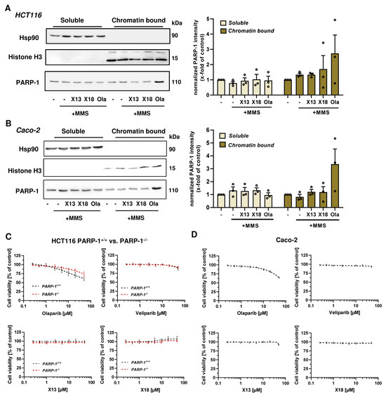 (A,B) Analysis of PARP-1 trapping in HCT116 and Caco-2 cells. Immunoblot detection of PARP-1 after pre-treatment with X17613, X17618, and olaparib followed by MMS exposure for 1 h and chromatin isolation. The cytosolic marker Hsp90 and the chromatin marker Histone H3 served as respective loading controls. Representative Western blot images and densitometric evaluation are shown (n = 3). Data are shown as mean + SEM. (C) Cell viability determined by the resazurin reduction assay (RRA) in HCT116 PARP-1−/− and HCT116 PARP-1+/+ cells after PARPi treatment for 72 h. A nonlinear regression curve fit was conducted using GraphPad Prism 9 (n ≥ 3). (D) Viability in Caco-2 cells after exposure to PARPi as indicated. (n = 3). All data are shown as mean +/− SEM.