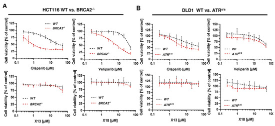 To investigate the impact of the cellular DDR on the cytotoxicity of PARP inhibitors, we used genetically engineered CRC cell models proficient or deficient for BRCA2 and ATR, respectively. Cell models were re-authenticated using Western blot analysis, which confirmed a lack of BRCA2 and ATR protein expression in the respective knockout model (Appendix A, Figure A4). Cytotoxicity testing revealed no impact of X17613 and X17618 on viability in HCT116 WT cells, whereas both compounds decreased viability in HCT116 BRCA2−/− cells by about 25% at the highest test concentration of 50 µM (Figure 4A). High cytotoxicity in the low micromolar concentration range was observed in HCT116 BRCA2−/− cells incubated with olaparib or veliparib. The determined IC50 values in BRCA2-deficient HCT116 cells were 18-times lower for olaparib and 5-times lower for veliparib in comparison to HCT116 WT cells (Table 1). Further experiments in DLD-1 WT and DLD-1 ATRs/s cells showed no effects of X17613 and X17618, irrespective of the ATR status (Figure 4B). Veliparib caused a concentration-dependent decrease in viability in both cell models, but concentration-response data did not allow for deriving IC50 values. Olaparib showed the strongest cytotoxic effects of all tested PARPi, which was affected by the ATR status. DLD-1 ATRs/s cells displayed a 3-fold higher sensitivity for olaparib than DLD-1 WT cells, as revealed by the respective IC50 values (Table 1). In summary, BRCA2 deficiency potentiated the sensitivity of CRC cells towards all tested PARPi (Olaparib » veliparib > X17613 ≈ X17618), while ATR deficiency only increased sensitivity towards olaparib.