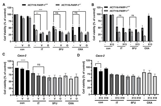 (A) Viability in HCT116 PARP-1−/− and HCT116 PARP-1+/+ cells after treatment with PARPi olaparib or veliparib in combination with chemotherapeutic drugs irinotecan (IT, 0.5 µM), 5-fluorouracil (5-FU, 0.25 µM), and oxaliplatin (OXA, 0.5 µM) for 72 h (n ≥ 3). (B) Viability in HCT116 PARP-1−/− and HCT116 PARP-1+/+ cells after treatment with PARPi X17613 in combination with chemotherapeutic drugs for 72 h. Data (n ≥ 3) are given as mean +/− SEM. (C,D) Viability in Caco-2 cells after treatment with PARPi in combination with chemotherapeutic drugs irinotecan (IT, 10 µM), 5-fluorouracil (5-FU, 5 µM), and oxaliplatin (OXA, 1 µM). Data (n = 3) are shown as mean +/− SEM. ns: p > 0.05, * p < 0.01, ** p < 0.01, *** p < 0.001, **** p < 0.0001; t-test.