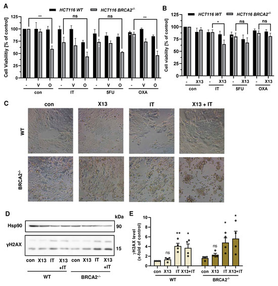(A) Viability in HCT116 WT and HCT116 BRCA2−/− cells after treatment with PARPi olaparib or veliparib in combination with chemotherapeutic drugs (IT, 0.25 µM), 5-fluorouracil (5-FU, 0.1 µM), and oxaliplatin (OXA, 0.25 µM) for 72 h (n ≥ 3). (B) Viability in HCT116 WT and HCT116 BRCA2−/− cells after treatment with PARPi X17613 in combination with chemotherapeutic drugs (IT, 0.25 µM), 5-fluorouracil (5-FU, 0.1 µM), and oxaliplatin (OXA, 0.25 µM) for 72 h (n ≥ 3). (C) Representative brightfield microscopic images at 20X magnification of HCT116 WT and HCT116 BRCA2−/− cells after treatment with X17613 (50 µM), IT (0.25 µM), or a combination of both for 24 h. (D,E) γH2AX formation in HCT116 WT and BRCA2−/− cells after treatment as described in (C). Representative Western blot images and densitometric evaluation are shown (n = 4). Hsp90 served as loading control. All data are given as mean + SEM. ns: p > 0.05, * p < 0.01, ** p < 0.01; t-test.