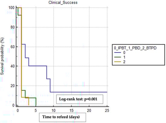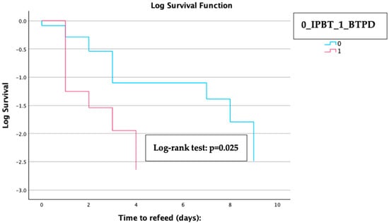 Kaplan–Meier analysis with a log–rank test revealed that patients in the BTPD subgroup experienced a significantly shorter median time to refeeding compared to those in the IPTB subgroup [1 day (IQR 0.3–1.2) for the BTPD subgroup vs. 3 days (IQR 1.9–4.1) for the IPTB subgroup; log–rank test p = 0.025] (Figure 3).